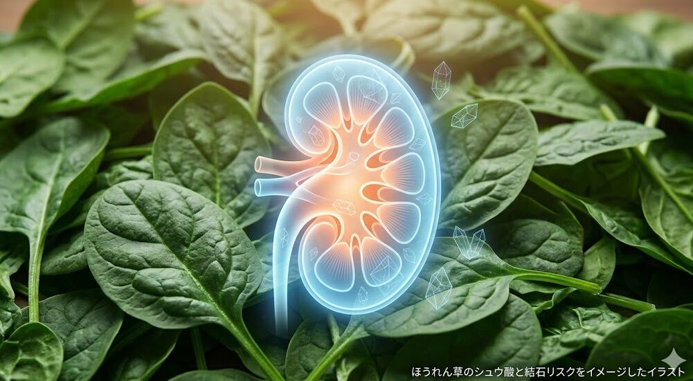 そして、このほうれん草に大量に含まれるシュウ酸こそが、「尿路結石」を引き起こす大きな原因の一つとなることが、現代の医学的にも明確に証明されています。(出典:文部科学省『日本食品標準成分表(八訂)増補2023年版』にて各食品の成分量が詳細に公開されており、ほうれん草の特異的な成分バランスが確認できます)。