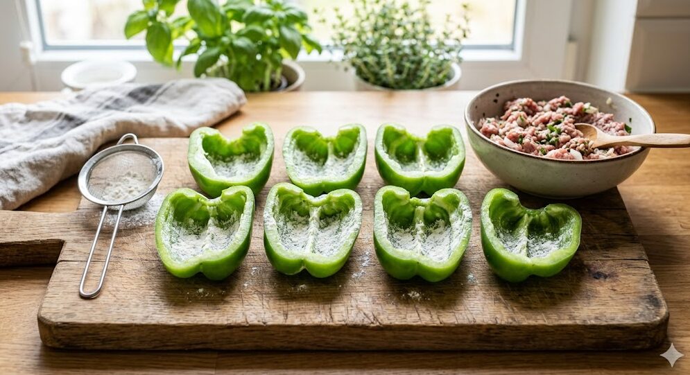 水分を拭き取ったら、ピーマンの内側に薄力粉(または片栗粉)を薄くまぶします。これが強力な「接着剤」の役割を果たします。