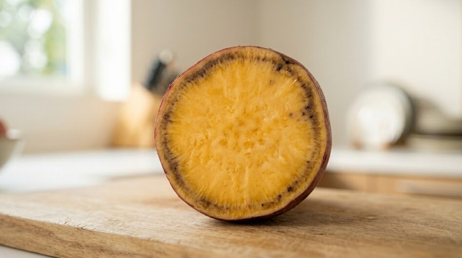 これは前述した通り、クロロゲン酸などのポリフェノールやヤラピンが酸素と反応して起きた「酸化(褐変)」です。 切る前は普通のサツマイモ色だったのに、切った後に変色した場合は、100%この酸化現象によるものです。 この部分はアクが強いため、そのまま食べると苦味やエグみを感じますが、決して有害ではありません。 変色した部分(皮の周辺)を包丁で厚めに切り落とすか、調理前に十分な「アク抜き」を行えば、安全かつ美味しく食べることができます。