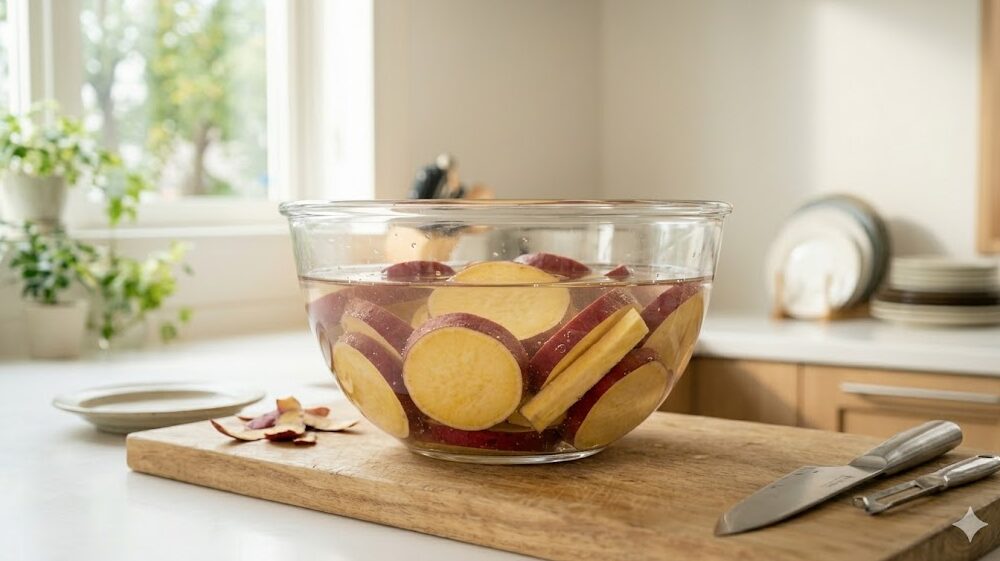 - 切ったらすぐに水に入れる:サツマイモの酸化は包丁を入れた瞬間から始まります。まな板の上で全部切り終わるのを待つのではなく、ボウルに水を張っておき、切った端から次々と水の中に放り込んでいくのが変色を防ぐコツです。